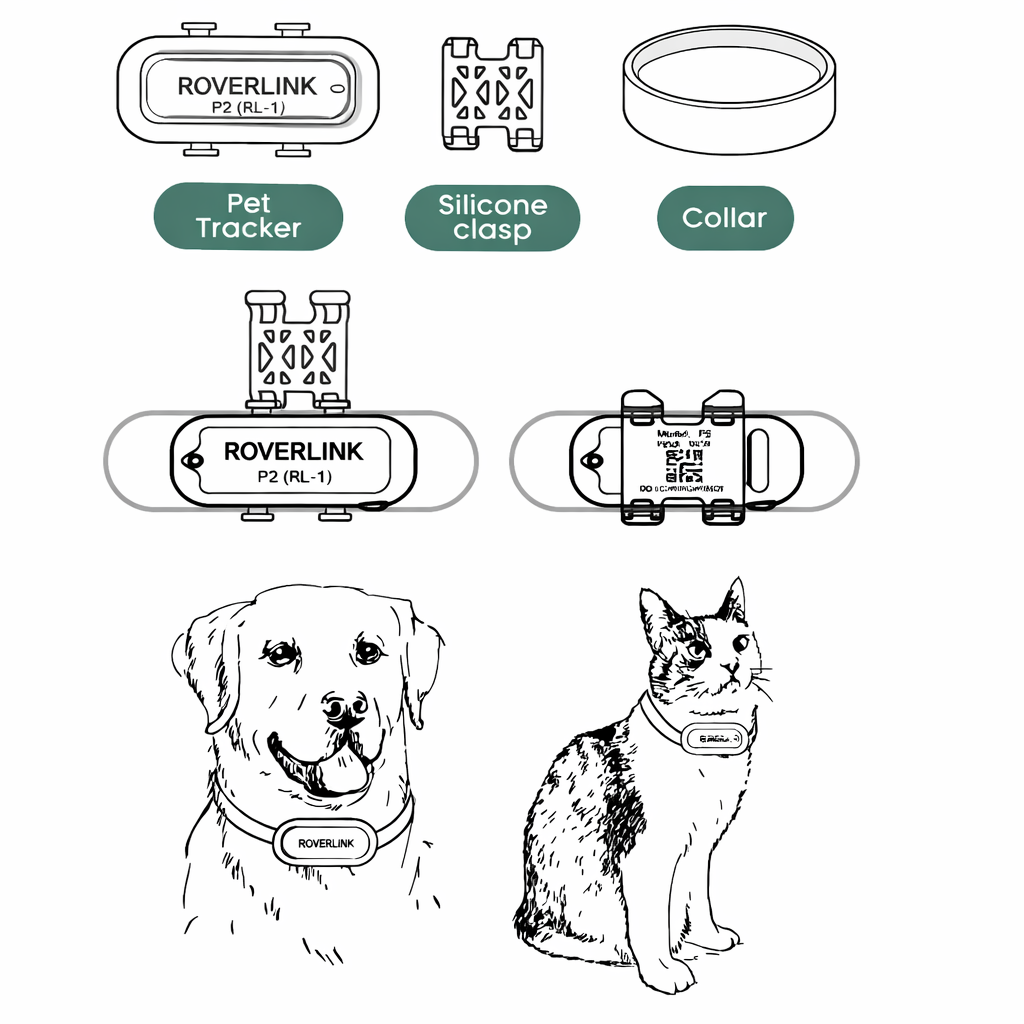 9) Attaching the Tracker to the Collar: Select the appropriate size collar (it might be the one you are already using on your dog), place the collar in the silicone clasp/buckle (use white one if your collar size is large & green one if it's small or medium), and then use the silicone clasp/buckle to secure the tracker on the collar. Make sure those 4 hooks on the tracker completey gets attached to their 4 designated places on the silicone clasp/buckle.